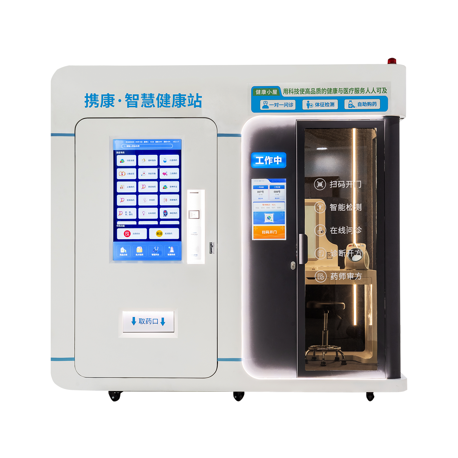 产品功能:互联网+物联网融合支持远程问诊,1000+药品在线购买24H便民服务居民家门口的智慧服务站,随时随地自助检测、自助拿药健康管理全流程闭环检测+问诊+开方+购药一体化服务
